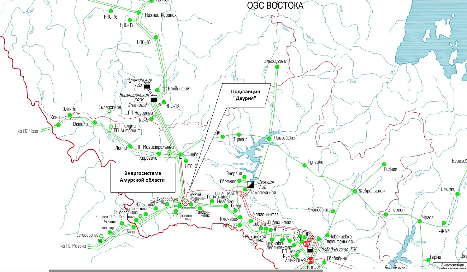 Позднее будет введена подстанция 500 кВ "Даурия" мощностью 501 МВА и линия электропередачи 500 кВ, которая соединит ее с "Агортой". От "Даурии" построят две линии электропередачи 220 кВ до действующей подстанции 220 кВ "Сковородино", которая участвует в электроснабжении газопровода "Сила Сибири"